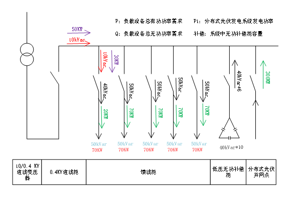 當設備運行時,則在市電進線柜,光伏發電系統反向倒送有功功率50KW,用電負載由市電提供無功功率,無功功率經過補償柜補償后,市電提供無功功率10kVar,