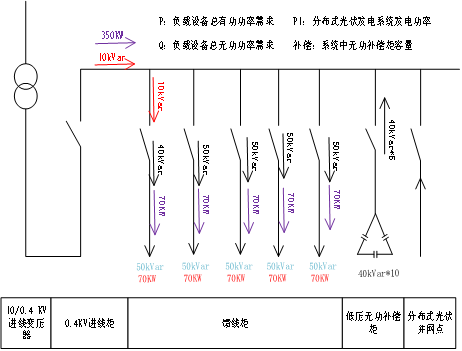 負載設備所需有功功率由(分布式光伏發電系統電源+電網電源)組成,負載設備所需無功功率由系統中無功補償柜子補償一部分,同時電網提供部分無功功率。